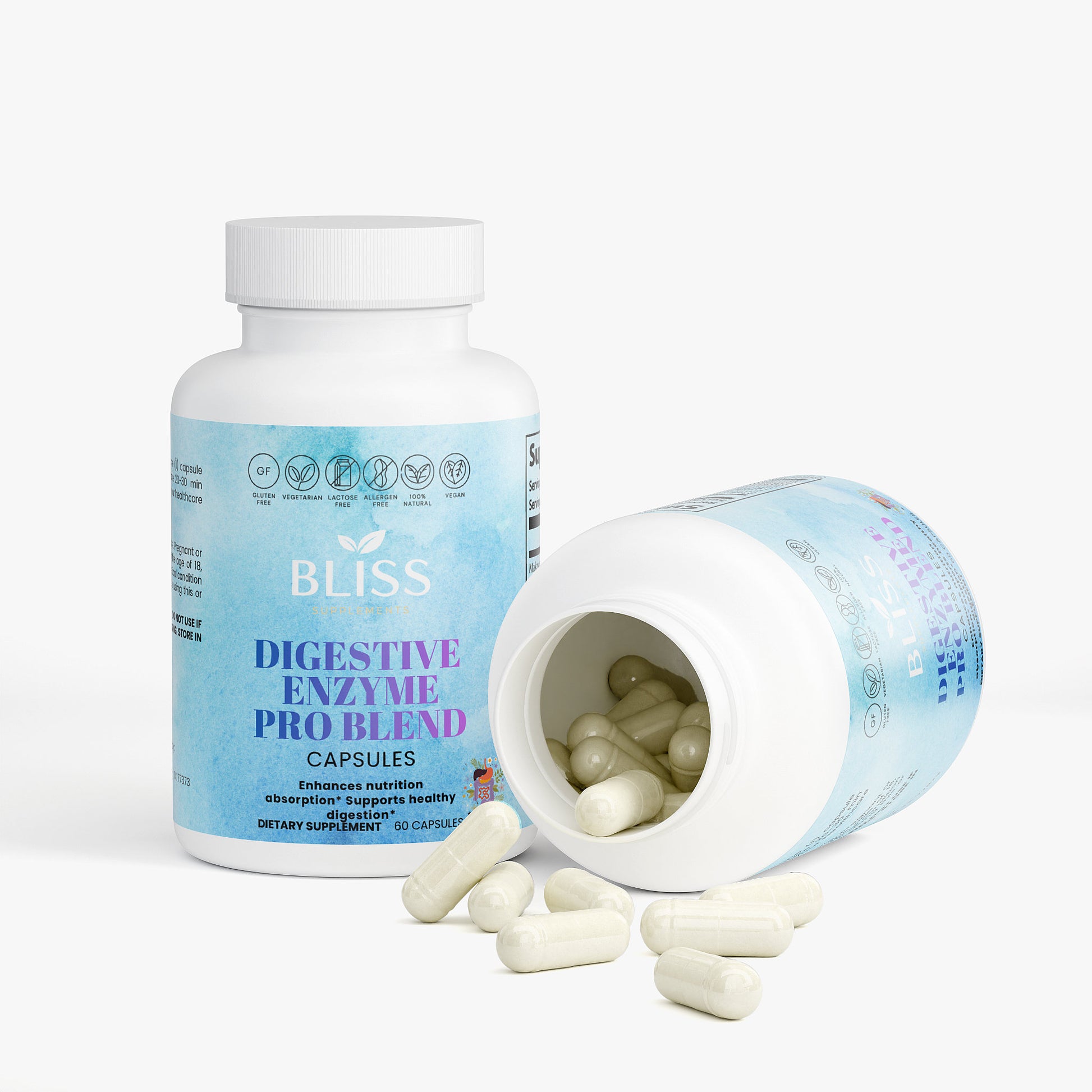 Digestive enzyme supplements help the body break down proteins, lipids, and carbs to aid digestion and assimilation of nutrients to produce more energy and a healthier life force.