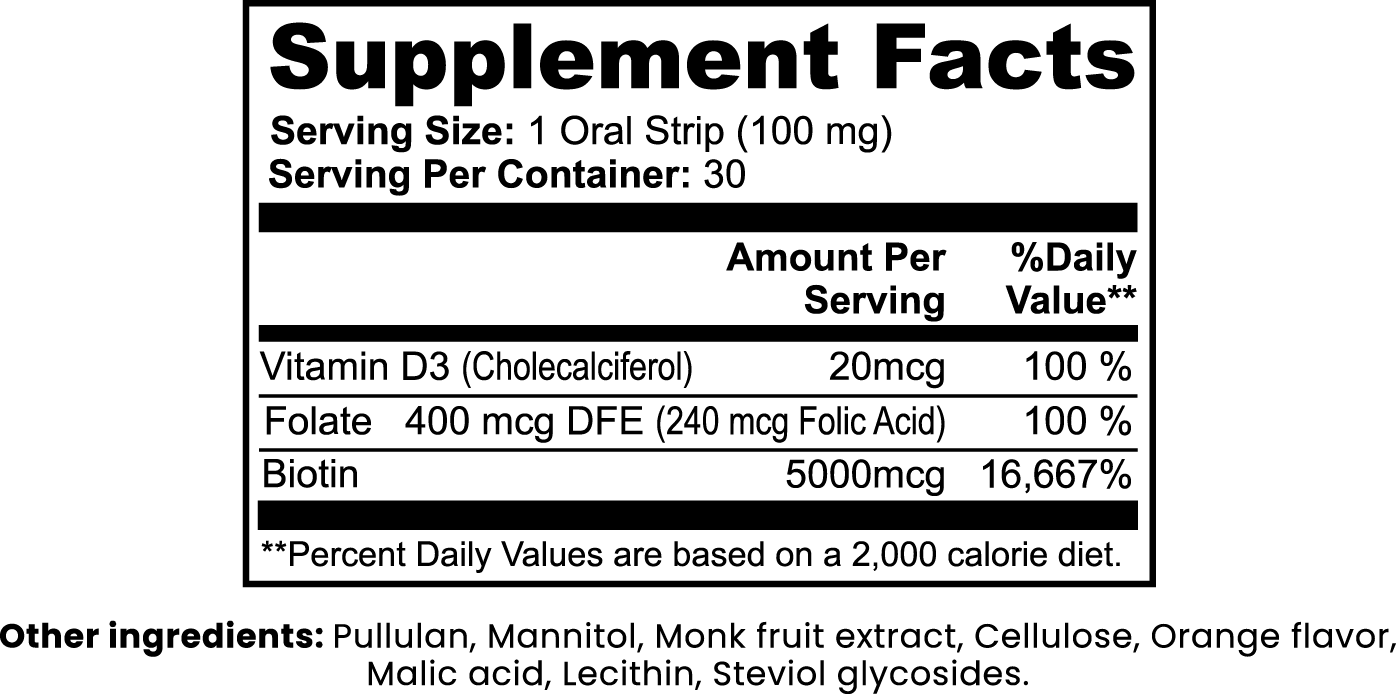 Each strip delivers 5,000 mcg of Biotin, a key nutrient that supports the body’s normal processes for maintaining healthy hair, skin, and nails. This formula also includes Folate (Vitamin B9) and Vitamin D3, helping support cellular health and overall well-being as part of a balanced lifestyle.